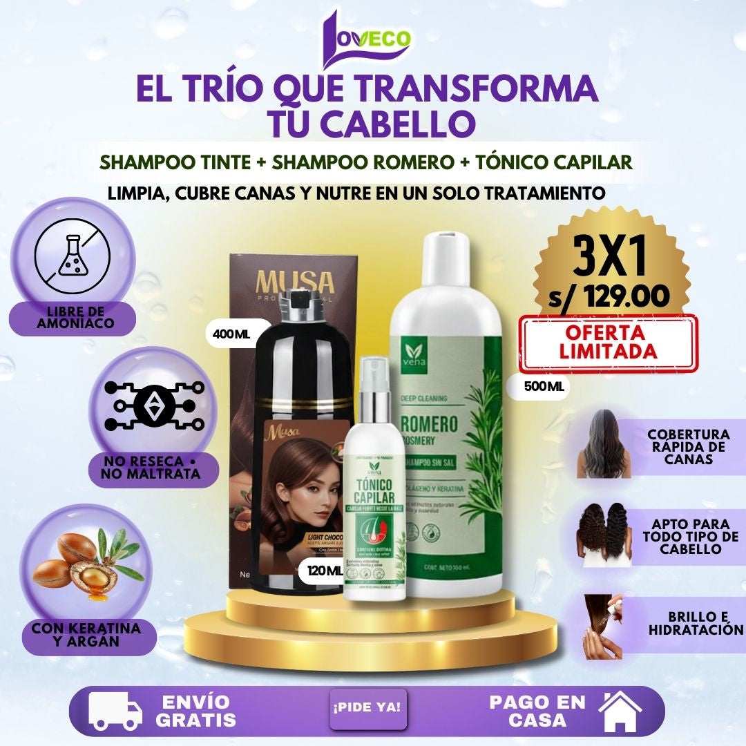 TRÍO COMPLETO ( SHAMPOO TINTE + SHAMPOO ROMERO + TÓNICO CAPILAR )
